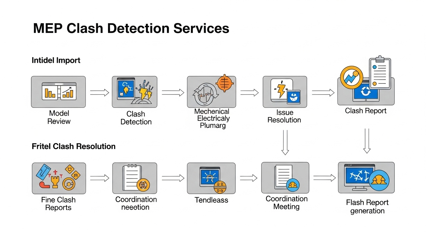 MEP clash detection services using BIM coordination to identify and resolve conflicts between HVAC, electrical, plumbing, and structural systems